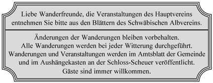 | 22. | Tageswanderung (Sonntag) "Klimawanderung" - Auf den Spuren der Klimageschichte der Sonnenalb. Geführte Themenwanderung für jung und alt, nur mit Voranmeldung. WF: Richard Löchel und Achim Schmielau |