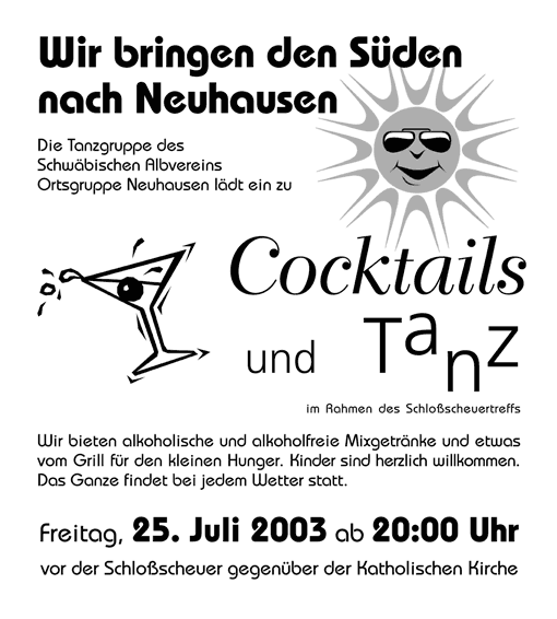 Wir bringen den Süden nach Neuhausen - das hatte man uns versprochen - und gehalten! Am letzten Freitagabend, den 25 Juli war das Ereignis! Nach dem Hitzerekord am Umzug waren wir allerdings nicht darauf bedacht, noch einmal 36 Grad aushalten zu müssen. Es war dann am Abend im Rahmen des Schlossscheuertreffs sehr angenehm, bei exotischen Drinks auf dem Hof im Freien, vor unserer Scheuer sitzen zu können. Besser hätte es unsere Tanzgruppe mit dem Wetter nicht bestellen und organisieren können! Die Temperaturen an diesem Abend waren genial angenehm - obwohl es noch Tage zuvor einige kleinere Abkühlungen mit Schauern gegeben hatte.