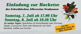 Auf Grund des Aktionstages der Gemeinde Neuhausen und der Schutzgemeinschaft Filder übernimmt der Albverein die Bewirtung dieser Veranstaltung. Unsere AV-Sommerhocketse findet daher an beiden Hocketse-Tagen auf dem freien Gelände neben der Araltankstelle statt!
